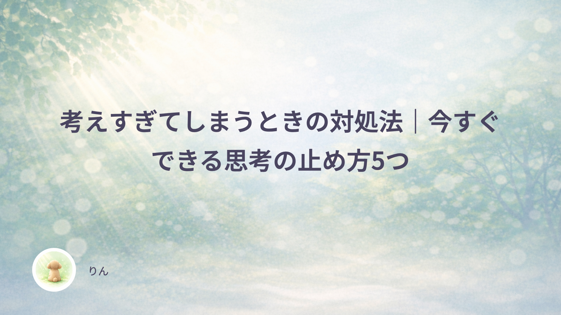 CATEGORY 心が疲れたとき 発言後に考えすぎてしまう人へ|あとから不安になる理由と心を落ち着かせる方法 2026.03.31 心が疲れたとき りん 心穏やかに生きる練習 感情に影響される人とされない人の違い|夫婦喧嘩が起きる本当の理由と対処法 2026.03.26 心が疲れたとき りん 心穏やかに生きる練習 職場で人の感情に影響されて疲れる人へ|心を守る考え方 2026.03.22 心が疲れたとき りん 心穏やかに生きる練習 愚痴を聞くと疲れるのはなぜ?原因と対処法 2026.03.19 心が疲れたとき りん 心穏やかに生きる練習 考えすぎてしまうときの対処法|今すぐできる思考の止め方5つ 2026.03.08 心が疲れたとき りん 心穏やかに生きる練習 仕事で心がモヤモヤした日の帰り道 2026.02.26 心が疲れたとき りん 心穏やかに生きる練習 疲れている日にやめた5つの事 2026.02.21 心が疲れたとき りん 心穏やかに生きる練習 何も出来てないと感じる日 2026.02.15 心が疲れたとき りん 心穏やかに生きる練習